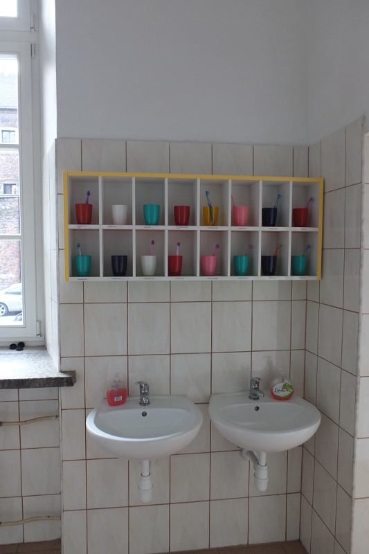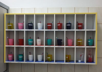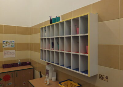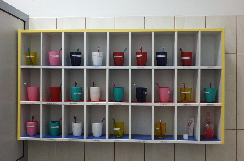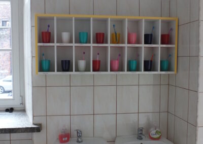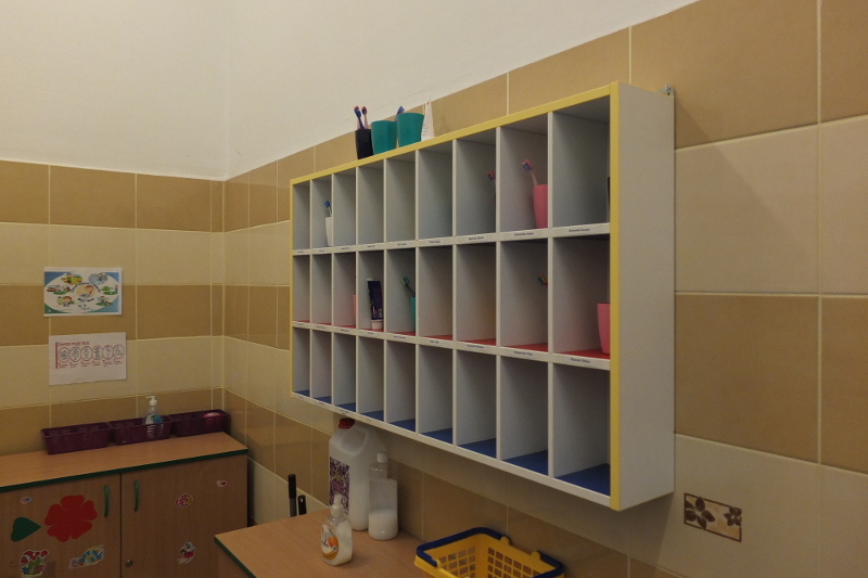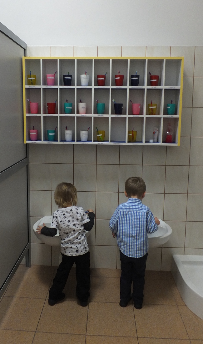 Wszystkie toalety w przedszkolu zostały przez nas wyposażone w specjalnie zaprojektowane półeczki na przybory toaletowe. W myśl przepisów, każde dziecko musi mieć swoją przegródkę na szczoteczkę i kubek, co zapobiega przenoszeniu się zarazków. Wszystkie dzieci otrzymały również „starter” – własną szczoteczkę, kubek i pastę do zębów.